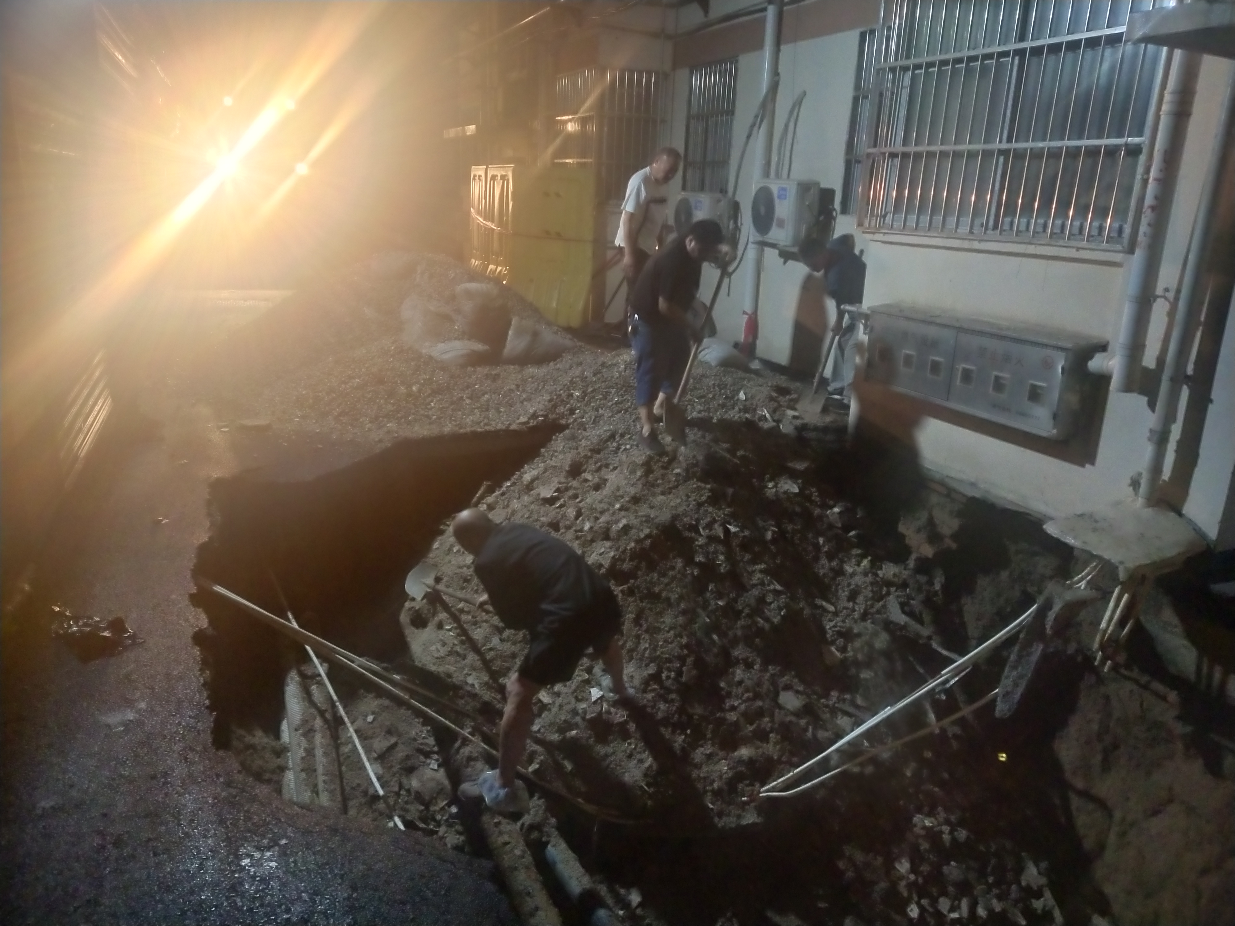 7月22日傍晚,接綠東村辦事處求助,桐柏社區(qū)伏牛路196號社區(qū)有樓棟門前路面塌陷,嚴(yán)重威脅居民安全,險(xiǎn)情就是命令,接到信息后,第一工程院黨總支立即響應(yīng),組織工程管理所專業(yè)人員前往現(xiàn)場組織搶險(xiǎn),在工業(yè)與智能中心主任劉勇以及第一工程院牛本軍、黃杰等人的合力協(xié)調(diào)下,柴油發(fā)電機(jī)、山貓車、鏟車等設(shè)備材料迅速到位,經(jīng)過徹夜搶修路面回填平整,排除了道路險(xiǎn)情。